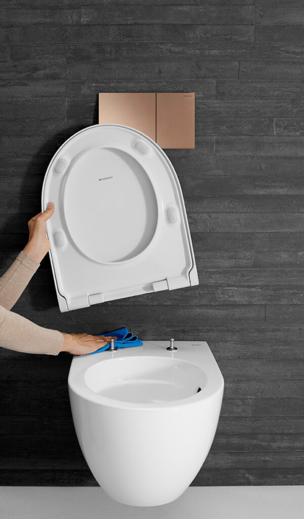 Neben den inneren Werten überzeugt das neue Geberit Acanto WC auch mit äußeren Werten: der WC-Sitz ist nun schlanker als der des Vorgängermodells. Die schlanke Form im Wrap-over Design ist mit einer Absenkautomatik und der QuickRelease-Funktion ausgestattet. Neben dem spülrandlosen Design ist die QuickRelease-Funktion entscheidend für die Reinigungsfreundlichkeit: Der WC-Sitz lässt sich inklusive Deckel mit nur einem Handgriff abnehmen und wieder aufstecken. Dazu werden WC-Sitz und -Deckel auf 90 Grad aufgeklappt und abgenommen. So können Keramik und Sitz hygienisch und vor allem mit weniger Zeitaufwand gereinigt werden – ohne schwer zugängliche Stellen.